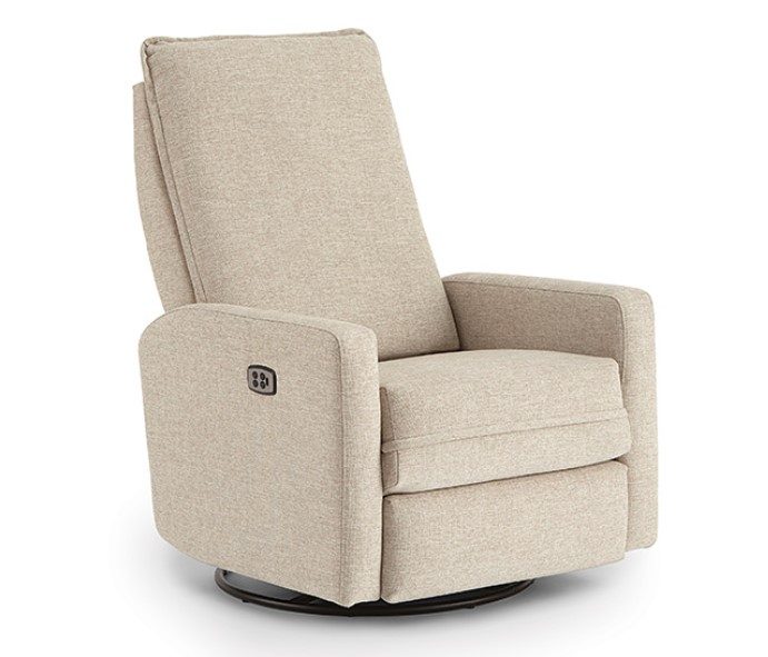 The Calli Swivel Glider Recliner is sleek, modern and perfectly sized to give a nursery, or any room, an instant update. Stylish details extend from the knife edge welt on back and seat to the power buttons that allow you to recline to any position at the simplist push. Deluxe your comfort and get extra support for your head and neck with the Power Tilt Headrest option that includes a USB port to conveniently charge your devices. Simplify your look by opting for the discreet inside recline handle. The smooth swivel glider action is soothing for the ultimate in relaxation. Choose from over a hundred fabrics to make it your own.