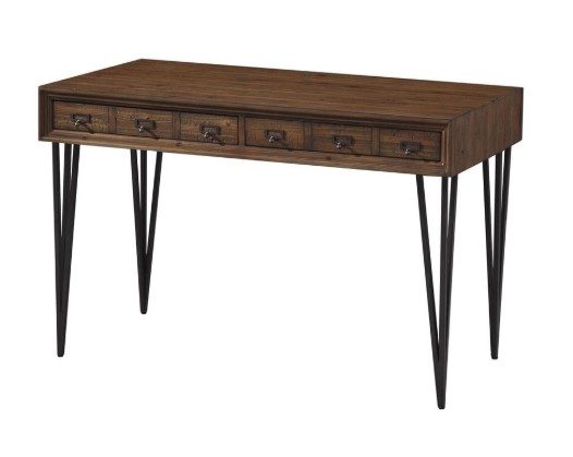 Behind your sofa or up against a wall, our Writing Desk / Console Table will add a touch of vintage ambiance to your decor. Finished all the way around in a rich Oxford Distressed Brown, and with triangular dark metal legs, our Console offers two spacious drawers for storing your papers and pens. And, as with the matching Cocktail and Side Tables, the same antiqued card file appearance that will make all your friends wonder if it is new, or a trendy Flea Market Flip!