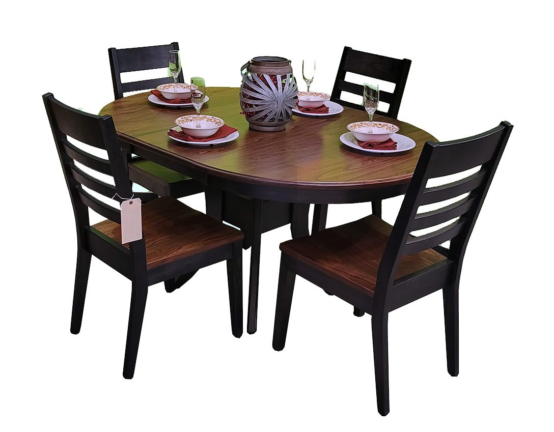 Get Amish quality at a fraction of the typical price! This beautiful set features a solid elm top and brown maple construction, all with a durable catalyzed varnish that will last for years. The table is 42″ round, and includes an 18″ leaf for flexible convenience. In stock as shown but fully customizable, you can choose from different table sizes and shapes, finishes, wood species, upholstered chairs, or even pick an entirely different chair! Come into one of our stores to see this amazing set in person and explore the possibilities! *NOTE: Picture shows 4 chairs, usually shown and sold with 6 chairs.