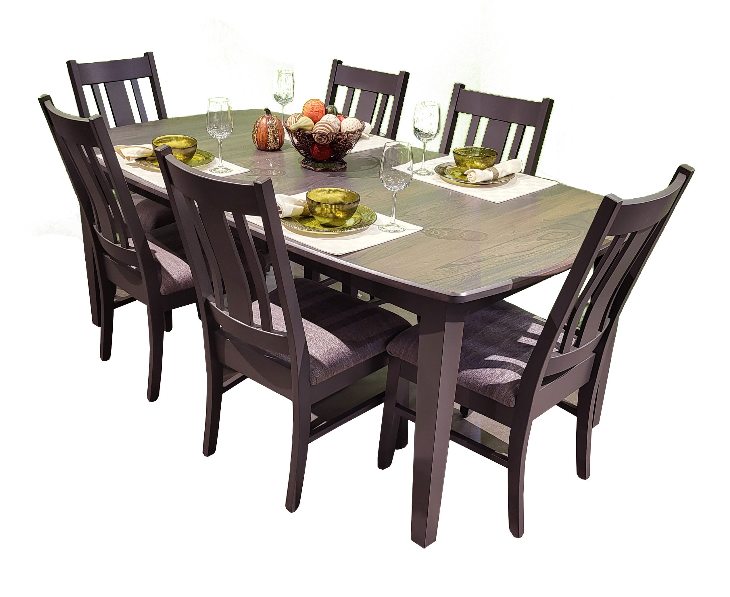 Get Amish quality at a fraction of the typical price! This beautiful set features a solid elm top and brown maple construction, all with a durable catalyzed varnish that will last for years. The table is 42×60″, and includes an 18″ self-storing leaf for flexible convenience. In stock as shown but fully customizable, you can choose from different table sizes and shapes, finishes, wood species, upholstered chairs, or even pick an entirely different chair! Come into one of our stores to see this amazing set in person and explore the possibilities! *NOTE: Picture shows 4 chairs, usually shown and sold with 6 chairs.