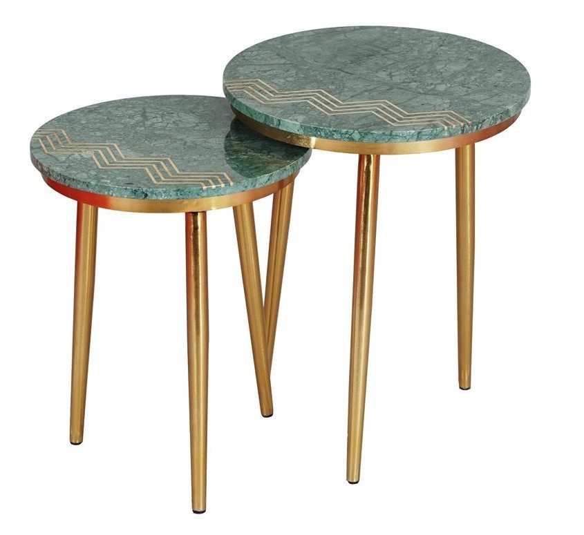 Striking and elegant, this set of two Nesting Tables will add a fun element to any place you choose to place them. Circular tops have been shaped from a beautiful natural Avery green marble, and accented with golden graphics to match the golden hue of the long tapered legs, a stunning combination. Use together or alone to add that sparkle and shine to your decor.