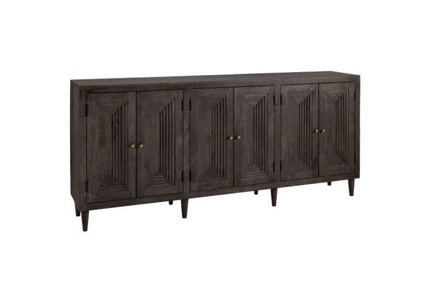 The Highland Park Sideboard blends timeless craftsmanship with bold, modern style. Made from rich, dark-stained wood, its four intricately carved doors create a striking geometric pattern that adds depth and character to any space. Brass-finished knobs provide a touch of warmth and elegance, while tapered legs lend a refined mid-century feel. Behind the doors, spacious shelving offers generous storage for dining essentials, serving ware, or household treasures, making it as functional as it is beautiful. Whether anchoring a dining room, entryway, or living area, the Highland Park Sideboard is a statement piece that delivers both style and practicality.
