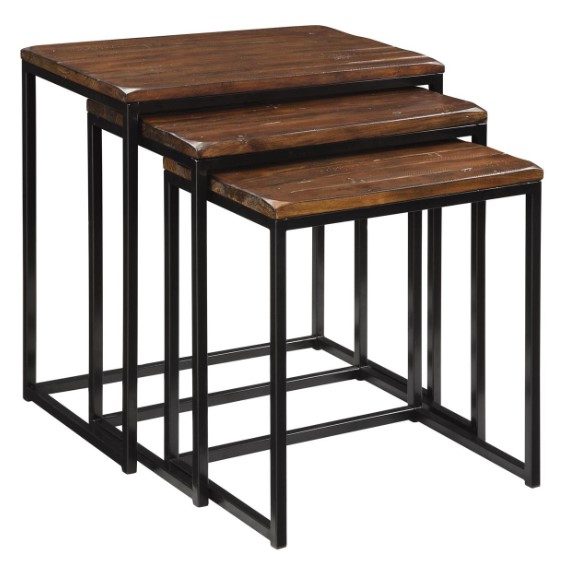 This set of three nesting accent tables is both functional and beautiful. The hand-hewn rustic tabletops have a distinct wood grain, chamfered corners and character marks for plenty of interest. The sturdy metal bases are finished in a flat black and textured finish.