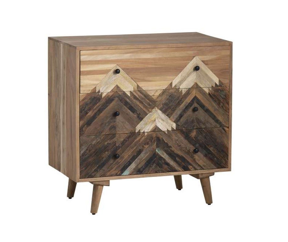 The Sierra Nevada Chest blends natural beauty with modern craftsmanship, featuring a bold mountain-inspired chevron pattern made from reclaimed wood in warm, earthy tones. Elevated on sleek tapered legs, this three-drawer chest offers generous storage for clothing, linens, or household essentials while bringing an artful touch to any room. Each piece is uniquely finished, highlighting the organic variations in the wood grain for a one-of-a-kind look. Perfect for bedrooms, living spaces, or entryways, the Sierra Nevada Chest delivers both function and statement-making style.